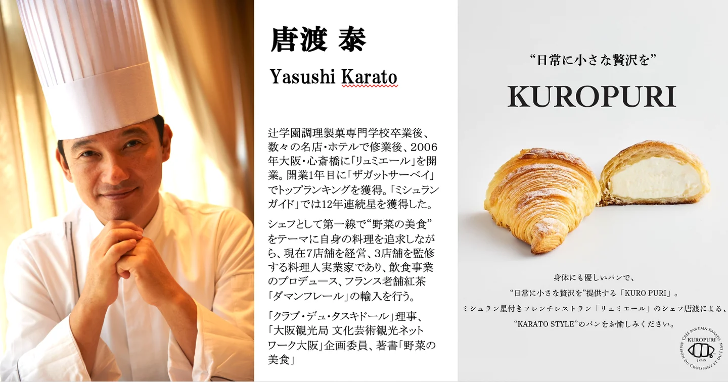 ミシュランガイドで12年連続で星を獲得したシェフが総合プロデュースするクロワッサン&プリン専門店『クロプリ(KUROPURI)』は、大阪・北浜で高い人気を誇る「パンカラト ブーランジェリーカフェ」において人気No.1のクロワッサン、人気No.2のプリンという二大看板商品をさらに磨き上げ、“クロワッサンとプリンの専門店”として誕生した新ブランドです。
