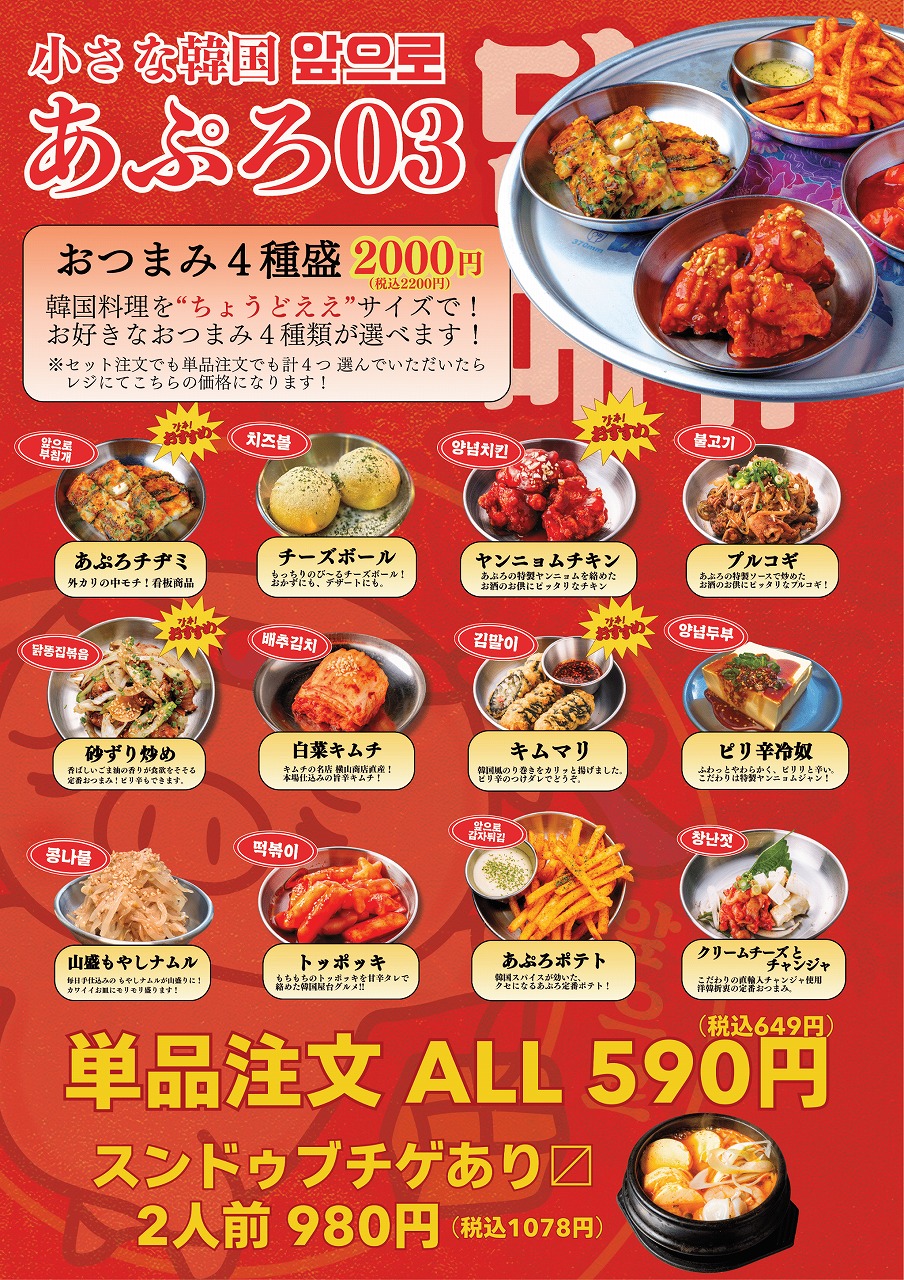 今回のリニューアルでは、より気軽に利用できる韓国料理店としてメニュー構成が見直されており、チヂミやトッポギなど600円台から提供される韓国屋台メニューがライインナップ。